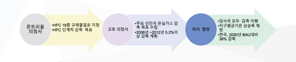 - 교토의정서, 몬트리올의정서 협약에 의거, 감축 및 금지 시기가 도래 함