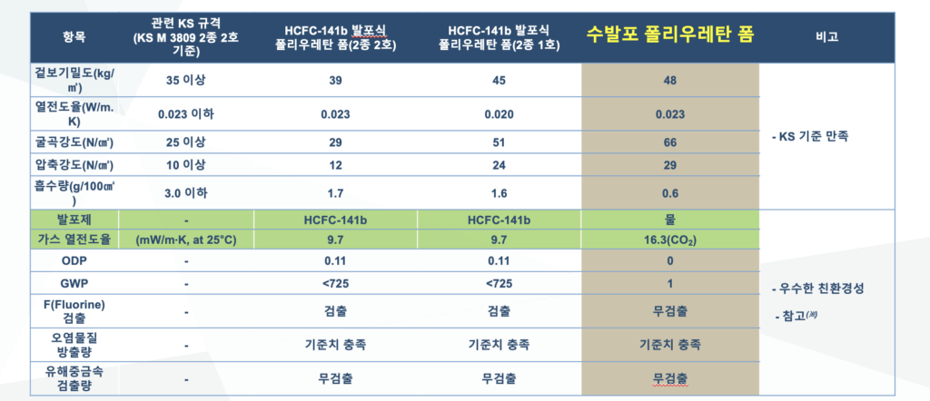 | 발포제 | - | HCFC-141b | HCFC-141b | 물 | 우수한 친환경성 |