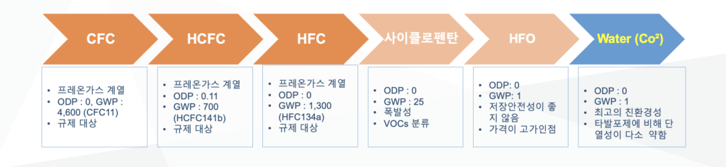 HCFC-141b, Pentane 등 유기용제형 발포제를 대체하여